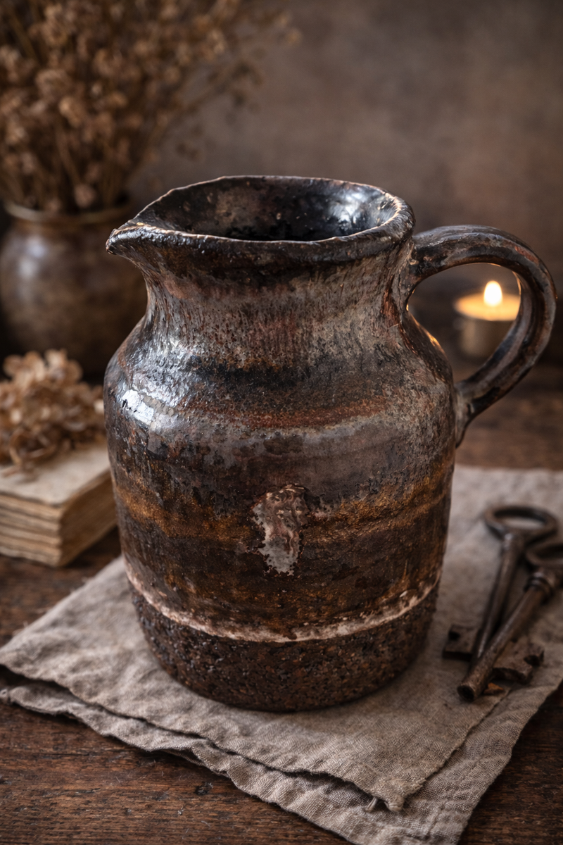 Liten, dekorativ kanne med levende glasur i varme brun- og kobbertoner. Den grove, naturlige bunnen gir et rått uttrykk, mens den glaserte overflaten fanger lyset vakkert.
