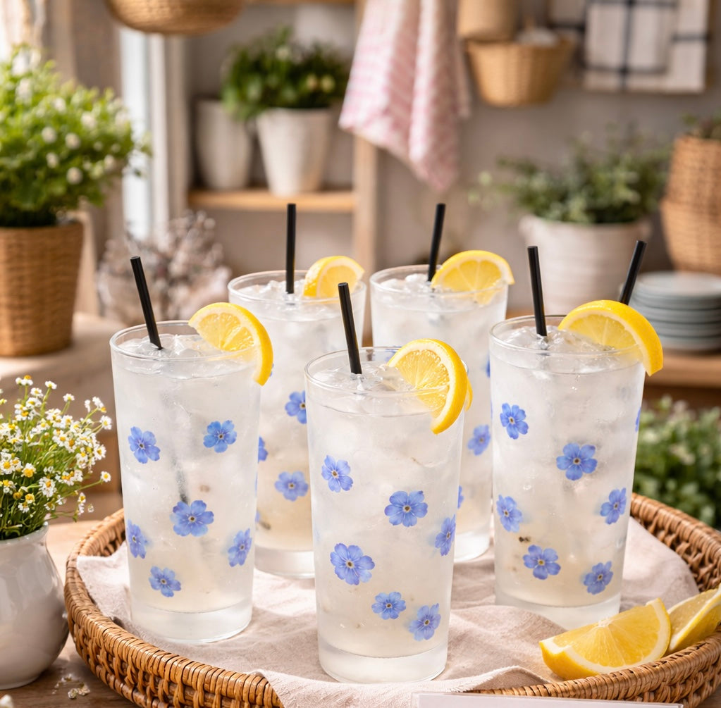 Delikate longdrink-glass i satengert glass med blomsterdekor og preget “France”-merking. Perfekte til limonade, iste og sommerbord. Et sjarmerende sett fra ca. 1970–90-tallet.
