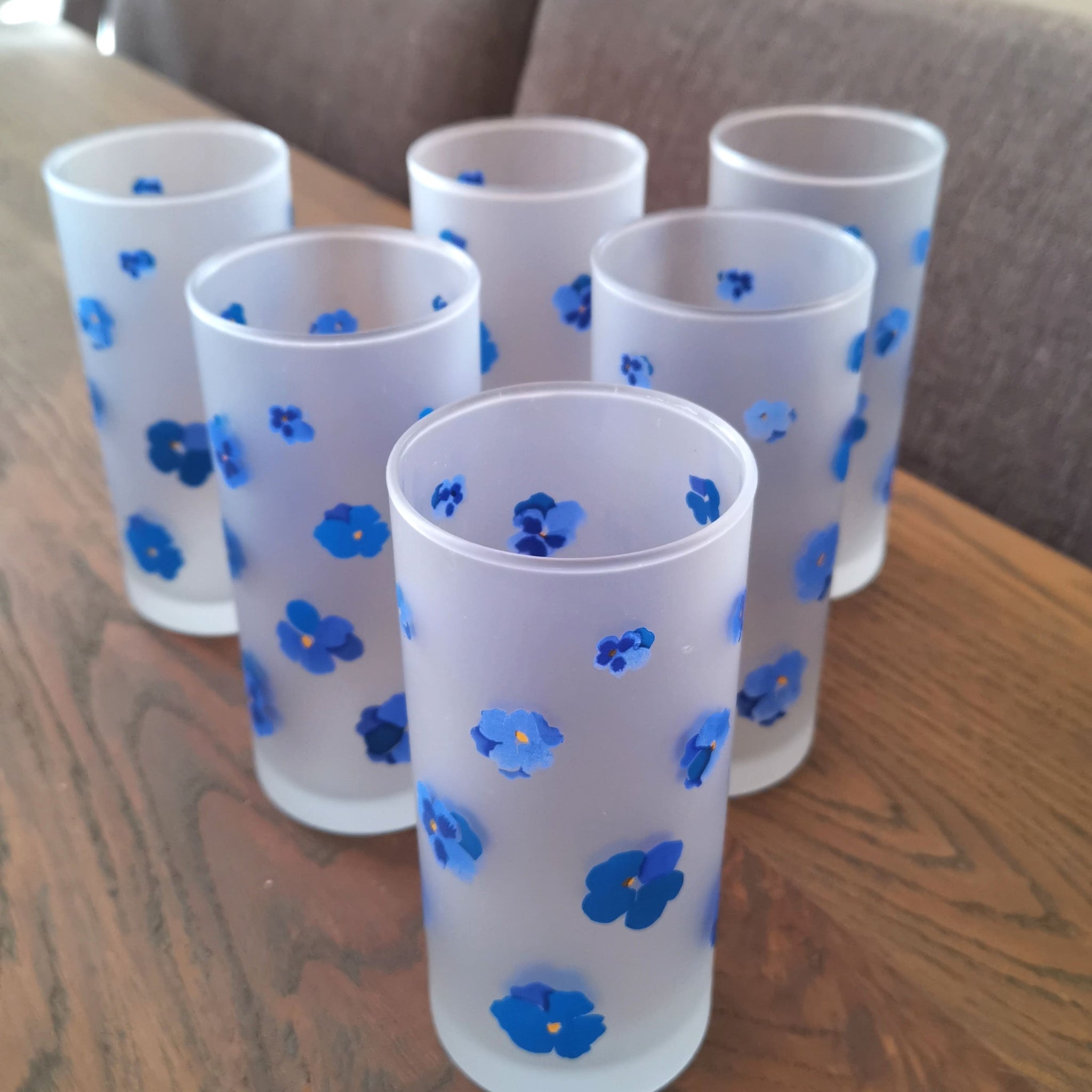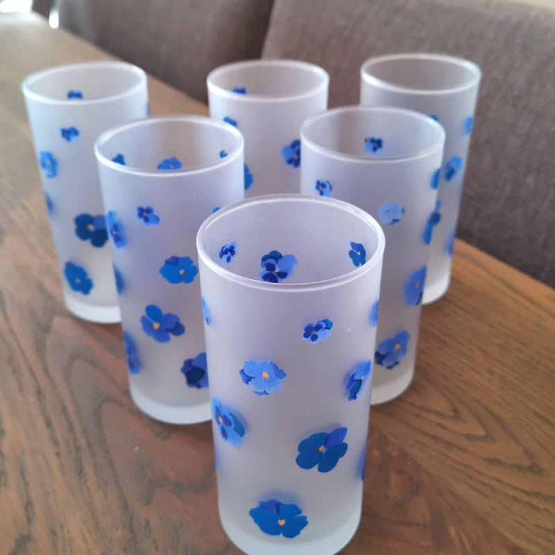 6 stk. høye glass med blomstermotiv i blått. H:14 cm. Pent brukt.